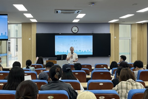 讲座中,月月姐姐身着一袭蓝色的旗袍,以伍子胥、苏轼、范仲淹、刘禹锡、白居易、范成大、贝聿铭等名人与苏州的故事为主线,通过三个原创视频生动形象地向同学们介绍了苏州,同学们跟随其讲解,感受到苏州独具特色的历史文化、旅游美食、名人典故和方言习俗。