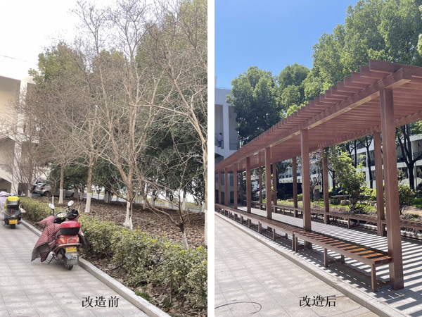改造中,基建与后勤管理处精心设计改造方案,用心把控施工细节,顺利完成交付工作。经过改造,后勤大楼北侧绿地得以精心规划,工作人员移除了该区域的枯枝杂草,并种植了多种景观树,铺设了鹅卵石道路,安装了紫藤架和长凳,为师生活动休憩提供了便利。三创学院屋顶花园经过防水补强处理后,铺设了防腐木地板,同时巧妙运用塑化仿石和窗洞元素,打造出旱山水文化氛围。此外,基建与后勤管理处还加强了3号北门周边景观清洁与绿化养护工作,确保校园环境的持久美观。