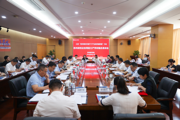 仪式后,恳谈会在我校综合楼三楼大会议室举行,苏州市委市级机关工委书记郁海明,我校党委书记芮国强,党委常委、副校长毛小勇,党委常委、党委组织部部长孙德芬等出席会议,会议由苏州市委市级机关工委副书记王群宇主持。会上,我校学院(部)、部门代表围绕产学研需求进行交流,相关苏州市机关部门、产业链企业代表进行回应。