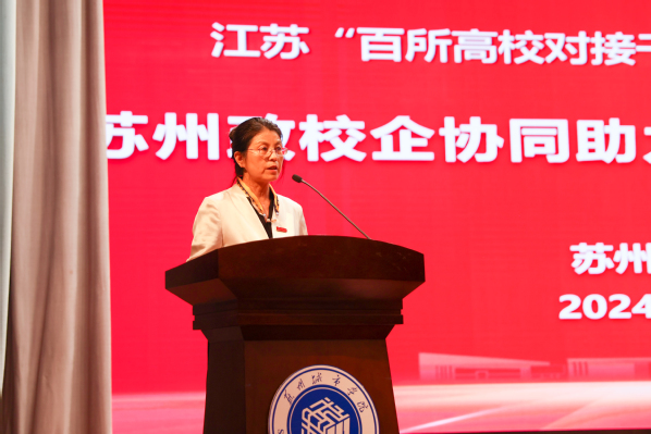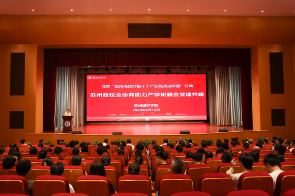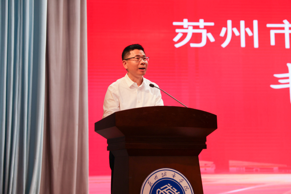芮国强在致辞中向莅临活动的领导、专家学者、产业链党委代表、企业代表以及师生代表们表示欢迎,向参与党建课题结对,协同支持产学研融合的机关部门、产业协会和链主企业表示敬意。他表示,党建联盟优势在“联”,产业链重点在“链”,以“盟”促“链”,既是“党建链”和“产业链”的双向奔赴,也是将党的政治优势、组织优势及学校的学科优势、专业优势、人才优势转化为产业发展优势的创新举措。他希望,以本次学校与12个单位企业就6个方向12项具体内容开展党建课题结对研究,同时加入苏州市大院大所党建联盟为契机,加强与地方单位、行业企业的交流合作,与行业更贴近、与企业更融合,完善供需对接机制,为学生提供更多实践实习就业的平台机会,加强有组织科研,凝聚更具备指向性的研究方向,积极发挥学校在党建经验、人才培养、科研力量等方面的资源作用。同时,为进一步助力“四链”深度融合,加快形成新质生产力贡献苏城院力量。