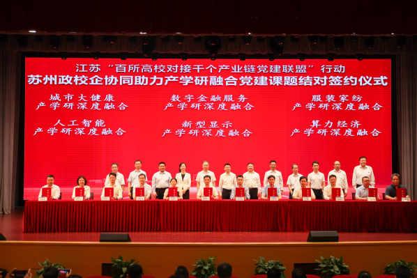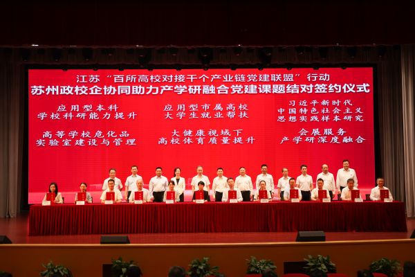 现场进行党建课题结对签约环节,签约仪式共分为两批,第一批是我校与苏州市科技局、苏州市人社局、苏州市应急管理局、苏州市体育局、吴江区盛泽镇、吴江文旅集团签约结对,第二批是我校与苏州康养集团、苏州市光子产业联合会、苏州市数字金融产业联合会、苏州太湖雪丝绸股份有限公司、科沃斯机器人股份有限公司、苏州市大数据集团签约结对。韦国岭、谢飞、黄锡明、郁海明、曹靖、徐卫、刘俊、石志伟、田嘉勇、杨益忠、芮国强、赵志宏共同上台见证。