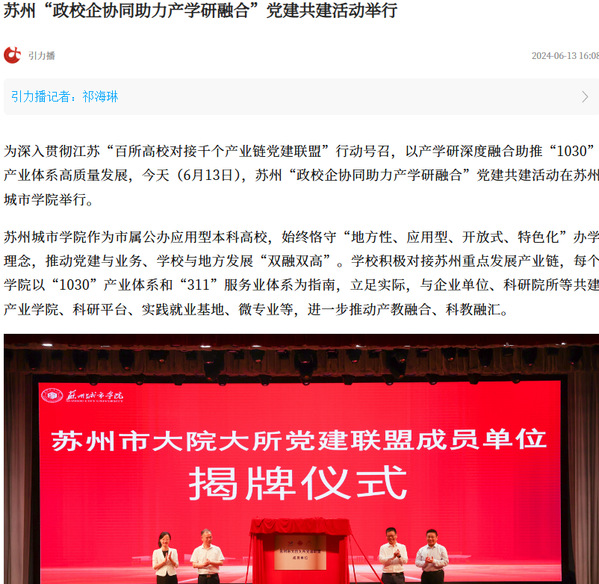 为深入贯彻江苏“百所高校对接千个产业链党建联盟”行动号召,以产学研深度融合助推“1030”产业体系高质量发展,今天(6月13日),苏州“政校企协同助力产学研融合”党建共建活动在苏州城市学院举行。