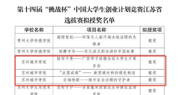 近期,第十四届“挑战杯”中国大学生创业计划竞赛江苏省选拔赛决赛在南京医科大学完美收官,我校选送的4项作品在本届比赛中表现出色,最终获得3银1铜的成绩,奖项层次和数量均取得历史新突破。