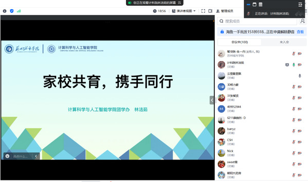为充分发挥家庭教育在大学生思政教育中的重要作用,形成家校育人合力,提升育人实效,共同促进学生的健康成长与全面发展,6月13日晚,智能制造与智慧交通学院、计算科学与人工智能学院联合国际合作交流处成功举办了线上家长会。国际合作交流处合作交流科科长邓小玲老师、合作交流科副科长潘涵老师、智能制造与智慧交通学院团学办主任朱一丹老师、计算科学与人工智能学院辅导员林洁茹、费婧怡老师以及中外专业的家长们共同出席了此次会议。会议由林洁茹老师主持。
