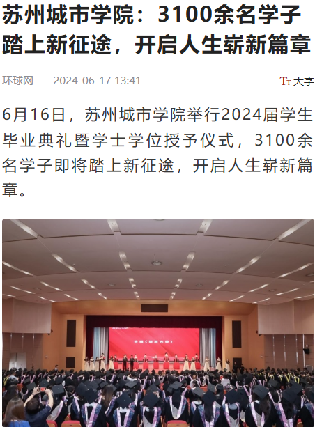 6月16日,苏州城市学院举行2024届学生毕业典礼暨学士学位授予仪式,3100余名学子即将踏上新征途,开启人生崭新篇章。