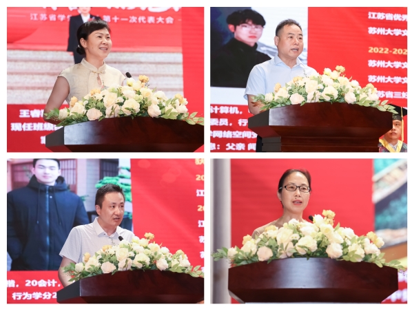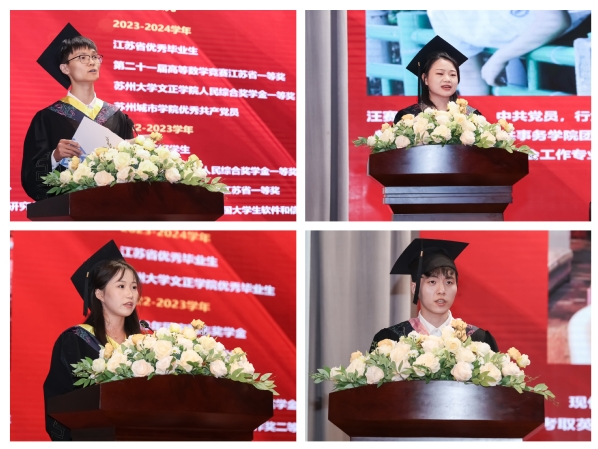 城市文化与传播学院20级播音与主持艺术专业王睿颖的家长吴雪薇、计算科学与人工智能学院20级计算机科学与技术专业闻锴的家长闻红兴、数字经济与管理学院20级会计学专业徐泽楷的家长徐静泓、设计与艺术学院22级环境设计(专转本)专业张馨月的家长陈育窈分别作为家长代表发言。吴雪薇祝愿大家带着母校赋予的知识学养和精神力量,带着老师和父母的殷切嘱托与循循教诲,踏上新的征程,朝着新的目标,继续努力、勇敢拼搏。闻红兴愿大家生逢盛世,不负盛世,生逢其时,奋斗其时,做一个诚实善良、明理守信、有远大理想、勇攀高峰、活泼健康、积极向上、信念坚定、有专业素养和家国情怀的人。徐静泓祝愿所有毕业生们前程似锦,未来可期,在人生的道路上不断追求卓越,实现自己的梦想和价值。陈育窈愿孩子们在未来的道路上,自强不息、厚德载物,成长蜕变为有胸怀、有格局、自信自强的苏城人,书写属于大家的青春芳华。