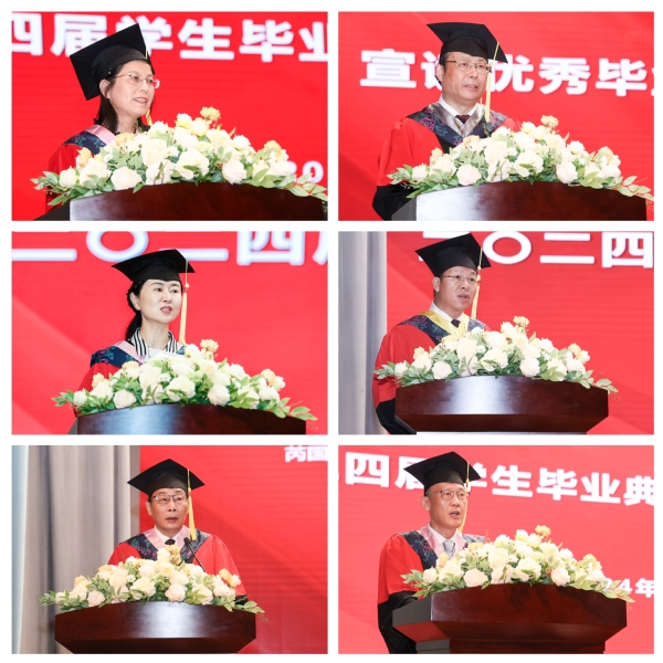 光学与电子信息学院院长雎胜老师、设计与艺术学院副院长刘咏清老师、智能制造与智慧交通学院院长郑建颖老师、数字经济与管理学院副院长李惠娟老师分别给各位同学致毕业赠言。雎胜向大家分享了“如何看待人生的经历”“关于热爱”“关于抉择”三个故事,并寄语毕业生们要有遵从内心和直觉的勇气,并不断积累,飞跃必来,突破随之。刘咏清对即将走入社会的同学们提出三点希望:一是保持好奇心,做终身的学习者;二是追求人本价值,坚守伦理道德;三是突破自我,做自己的英雄。郑建颖分享四点感悟:一是坚定信念、志存高远;二是脚踏实地、勇于追梦;三是开拓创新、敢为人先;四是乐观豁达、热爱生活。李惠娟叮嘱同学们培养终身学习好习惯、锻炼斗志昂扬好身体、养成知恩图报好品质、牢记千年姑苏好地方,在未来的人生长河中每一天都健康、自信、奋斗。