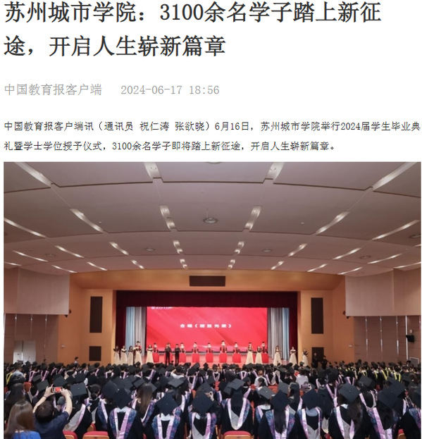 6月16日,苏州城市学院举行2024届学生毕业典礼暨学士学位授予仪式,3100余名学子即将踏上新征途,开启人生崭新篇章。