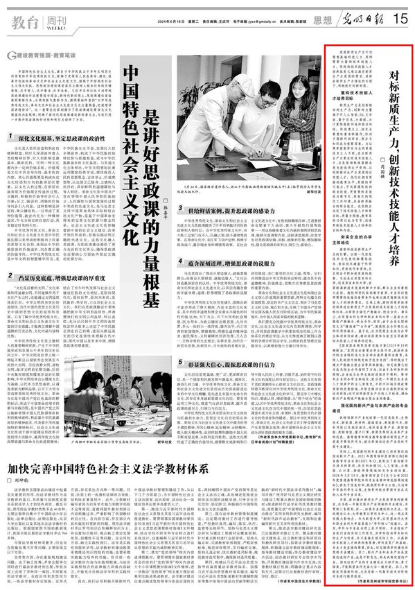 6月18日,《光明日报》刊发我校党委书记芮国强署名文章。文章指出,发展新质生产力不仅需要高端研发人才,同样需要大量的技术技能人才。传统的技术技能人才培养体系已难以满足新质生产力发展的需求,亟须在新质生产力理论的引领下,积极进行创新转型。文章全文如下: