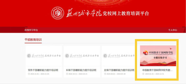 登录“中国教育干部网络学院”专题学习页面后,选择“苏州城市学院干部年度线上培训(2024年)”进行学习。如果干部曾在苏大参加过处级干部线上培训,页面会同时存在“苏州大学中层干部学习专题”和以往培训记录,仅需选择“苏州城市学院干部年度线上培训(2024年)”进行学习。
