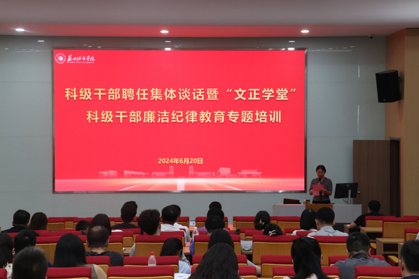 6月20日下午,我校科级干部聘任集体谈话暨“文正学堂”科级干部廉洁纪律教育专题培训在2-101举办。本次活动旨在抓好新提拔干部、年轻干部等重点对象的纪律培训,加强对干部的日常纪律提醒,推动我校党纪学习教育走实走深。校党委常委、纪委书记、监察专员李萍,校党委常委、组织部部长孙德芬,全校科级干部参加培训。培训由党委组织部副部长邢超主持。