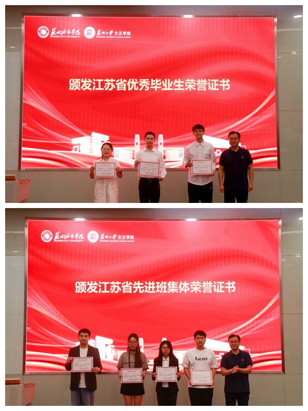 卞海勇为江苏省优秀毕业生代表、江苏省先进班集体颁发证书。