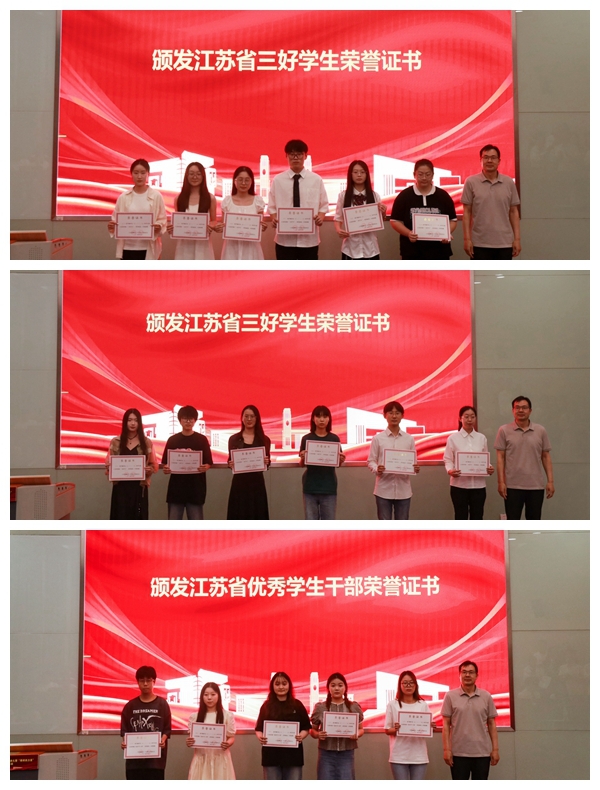 尹维军为江苏省三好学生、江苏省优秀学生干部获奖学生颁发证书。