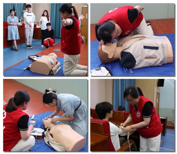 出征仪式结束后,苏州大学附属瑞华医院刘海玉医生面向暑期社会实践校级立项团队成员和院级立项团队代表开展安全培训,现场演示并教授海姆立克急救法、心肺复苏术和AED使用方法,同学们认真学习,自我防范的意识和能力得到提升,并深刻意识到实践安全的重要性。