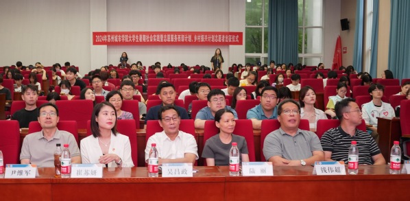 校团委副书记崔苏妍宣读2024年苏州城市学院大学生志愿服务西部计划、乡村振兴计划录取志愿者名单和2024年苏州城市学院大学生暑期社会实践校级立项团队名单。我校2024年大学生志愿服务乡村振兴计划志愿者武楷奇、暑期社会实践学生代表梁思佳分别分享了他们参与社会实践、志愿服务的初心和经历,表示将在社会实践大课堂和基层一线中磨砺意志、锻炼体格、增长才干,展现苏城学子的责任担当;暑期社会实践指导教师代表卢晓晖结合自己的成长经历分享了他指导社会实践团队的初衷,号召全体指导教师切实履行“教书育人”职责,勇担责任、以身作则,扎实有效完成社会实践任务。