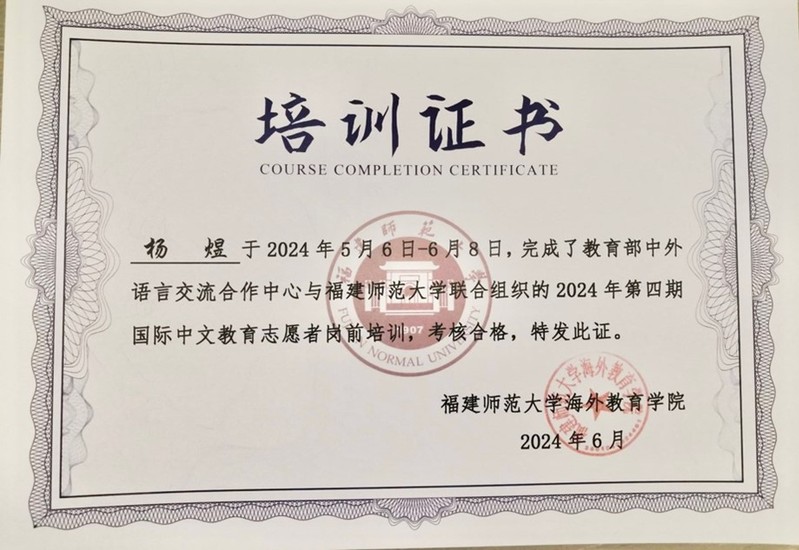 近日,我校城市文化与传播学院2020级汉语国际教育专业杨煜同学被录取为南非中国文化中心国际中文教育志愿者。目前,该生已通过教育部中外语言交流合作中心组织的国际中文教育志愿者岗前培训,即将赴南非进行国际中文教育工作。