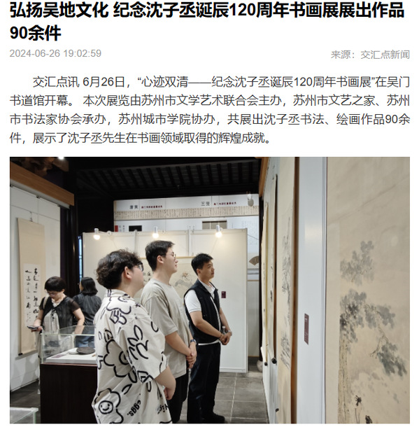 交汇点讯 6月26日,“心迹双清——纪念沈子丞诞辰120周年书画展”在吴门书道馆开幕。 本次展览由苏州市文学艺术联合会主办,苏州市文艺之家、苏州市书法家协会承办,苏州城市学院协办,共展出沈子丞书法、绘画作品90余件,展示了沈子丞先生在书画领域取得的辉煌成就。