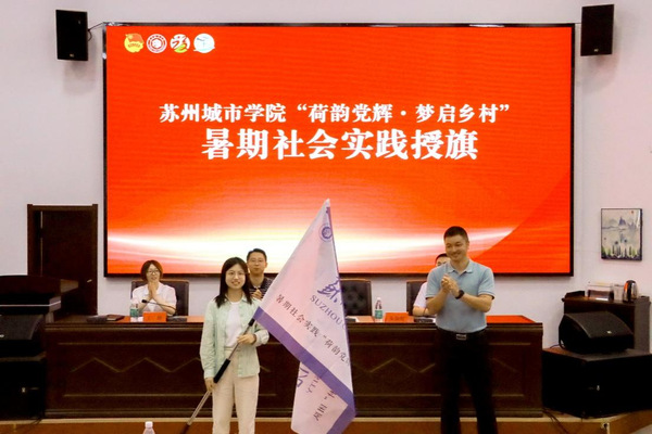 授旗环节,丁海峰将暑期社会实践团队队旗郑重授予社会实践团队指导老师陶然手中。这面旗帜不仅承载着金湖县和苏州城市学院设计与艺术学院的信任和期望,更寄托了团队学生对实践活动的无限憧憬和美好愿望。