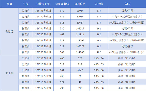 今年我校进一步优化生源结构,省内招生计划1794人,考生报考关注度和热情保持良好态势,生源数量稳定、质量较好。录取美术类专业考生166名,其中历史等科目类考生120名,物理等科目类考生46名;录取普通类考生1628名,其中历史等科目类考生501名,物理等科目类考生1127名。各院校专业组投档线较去年保持平稳,其中历史类01、03院校专业组、物理类06院校专业组录取位次上涨幅度较大。各院校专业组录取分数线位次排名情况详见下表。