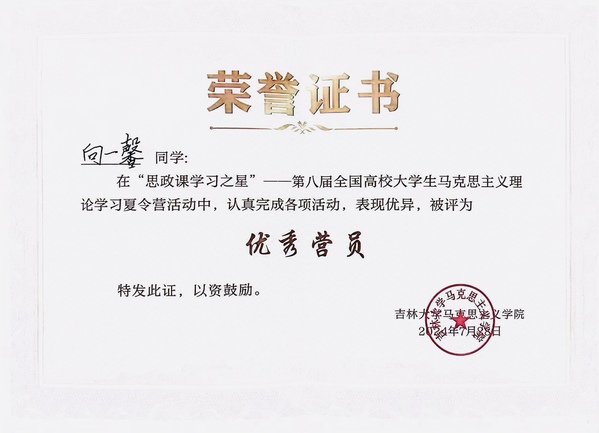 7月21日至28日,由教育部高校思政课教学指导委员会主办、吉林大学承办的“思政课学习之星”——第八届全国高校大学生马克思主义理论学习夏令营活动于吉林省长春市等地举办,来自全国各地的150余名大学生参加本次活动。第七届全国高校大学生讲思政课公开课展示活动本科组一等奖团队主讲人、我校城市文化与传播学院2022级汉语言文学专业学生向一馨作为江苏省学生代表参加,在“和谐吉林”小分队中担任宣传委员,认真完成学习任务,积极参与各项工作,顺利结业并获评“优秀营员”称号。