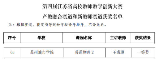 第四届江苏省高校教师教学创新大赛产教融合赛道及新教师赛道决赛于7月6日-7日在东南大学九龙湖校区顺利举行。我校光学与电子信息学院王成琳老师主讲的《普通物理2》课程,荣获省赛(新教师赛道)一等奖。
