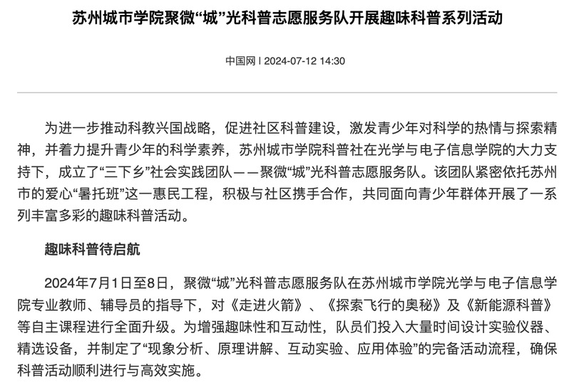 据悉,苏州城市学院聚微“城”光科普志愿服务队将在学院支持下,在暑期举办近30场志愿科普活动。该服务队以大学生为主体,开展系列科普活动,这不仅是苏州城市学院光学与电子信息学院“科教融城”思政品牌建设的关键内容,也是学院实践育人的重要载体。