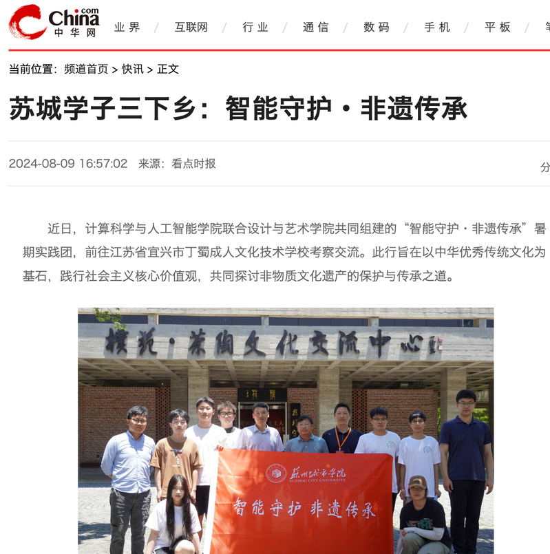 近日,计算科学与人工智能学院联合设计与艺术学院共同组建的“智能守护·非遗传承”暑期实践团,前往江苏省宜兴市丁蜀成人文化技术学校考察交流。此行旨在以中华优秀传统文化为基石,践行社会主义核心价值观,共同探讨非物质文化遗产的保护与传承之道。