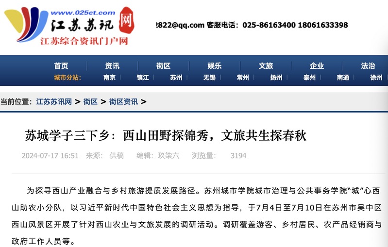 为探寻西山产业融合与乡村旅游提质发展路径。苏州城市学院城市治理与公共事务学院“城”心西山助农小分队,以习近平新时代中国特色社会主义思想为指导,于7月4日至7月10日在苏州市吴中区西山风景区开展了针对西山农业与文旅发展的调研活动。调研覆盖游客、乡村居民、农产品经销商与政府工作人员等。