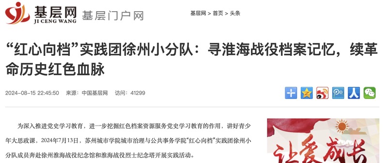 为深入推进党史学习教育,进一步挖掘红色档案资源服务党史学习教育的作用,讲好青少年大思政课,2024年7月13日,苏州城市学院城市治理与公共事务学院“红心向档”实践团徐州小分队成员奔赴徐州淮海战役纪念馆和淮海战役烈士纪念塔开展实践活动。