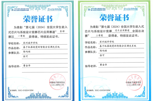 暑假期间,第七届全国大学生嵌入式芯片与系统设计竞赛全国总决赛在南京落下帷幕,计算科学与人工智能学院学生陈屿桢、张可在曹金华老师指导下荣获国赛二等奖、省赛一等奖,为学院参加首次获得该项赛事的国家级奖项。