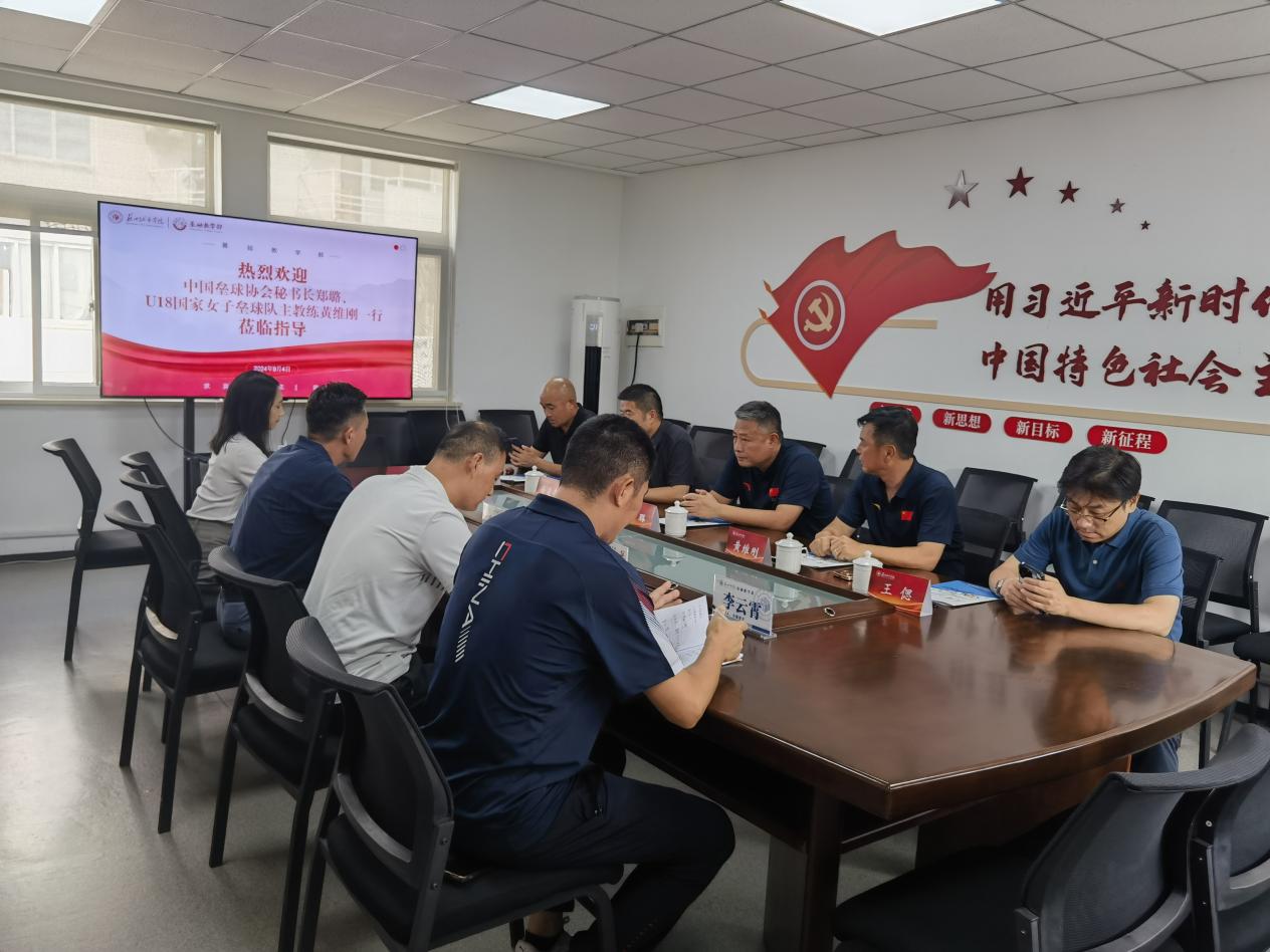 为服务地方体育文化建设,促进垒球运动普及与提高,9月4日,中国垒球协会秘书长郑璐、U18国家女子垒球队主教练黄维刚、吴中区文化体育和旅游局副局长徐凌奇、吴中区棒垒球运动协会(筹)会长吴春保等一行五人来我校调研垒球运动开展情况并展开座谈交流。基础教学部党委书记、主任李勇,未来体育产业研究院副院长陈玉萍,体育系主任程广振,国际级棒垒球裁判李云霄陪同参观并参与座谈会。会议由李勇主持。
