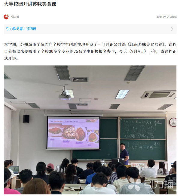 本学期,苏州城市学院面向全校学生创新性地开设了一门通识公共课《江南苏味美食营养》。课程自公布以来便吸引了全校30多个专业的75名学生积极报名参与,今天(9月4日)下午,该课程正式开讲。