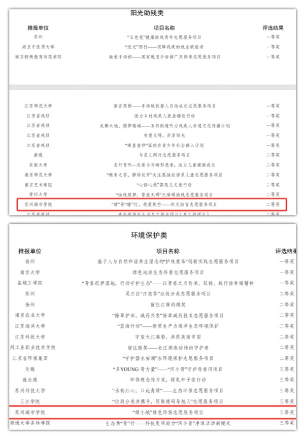 近日,由江苏团省委、江苏省委社会工作部、江苏省青年志愿者协会举办的2024年江苏省青年志愿服务项目大赛暨第七届中国青年志愿服务项目大赛江苏省选拔赛成功举办。本届大赛以“志愿新时代 共筑中国梦”为主题,共有686个项目报名参赛,我校团委积极响应,组织师生备赛参赛,经过项目资格审核、专家线上阅评、线下路演答辩等环节,我校“‘睛’彩‘瞳’行,筑爱筑芒——阳光助盲志愿服务项目”获“阳光助残类”二等奖,“绿小纸”绿色环保志愿服务项目获“环境保护类”三等奖。