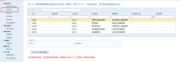 (一)学生登录微专业系统,(账号密码同数字门户一样);或者通过学校(数字门户—微专业管理),进去后,点击“在线报名”,选择自己有意向的微专业,点击报名即可。