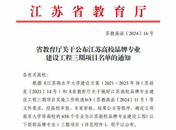 根据江苏省教育厅印发《省教育厅关于公布江苏高校品牌专业建设工程三期项目名单的通知》(苏教高函〔2024〕16号),我校3个专业获批江苏高校品牌专业建设工程三期项目。