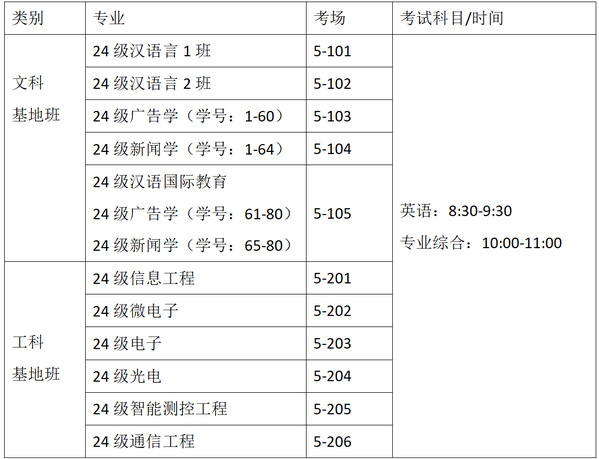 根据《关于开展2024级文正书院基地班学生选拔的通知》(教字〔2024〕163号)文件精神,经城市文化与传播学院、光学与电子信息学院宣传动员,文科基地班共有222名学生报名,工科基地班共有300名同学报名。根据报名初审情况,于9月19日组织笔试,具体安排如下: