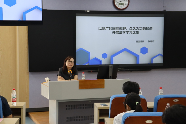 最后,张继红以“以宽广的国际视野、久久为功的韧劲开启法学学习之旅”为题进行了“法律实务专家大讲堂”第一讲。她围绕我国涉外法治人才的重要性与稀缺性、涉外法治人才所应具备的能力等方面展开分析,将鲜活的案例和精准的数据娓娓道来,着重阐释了涉外法治人才需具备的站稳中国立场、涵养国家情怀的能力以及培养法律思维、适用法律处理问题的能力。就法科学生的职业规划、职业素养等话题,张继红庭长与现场师生进行了互动交流。