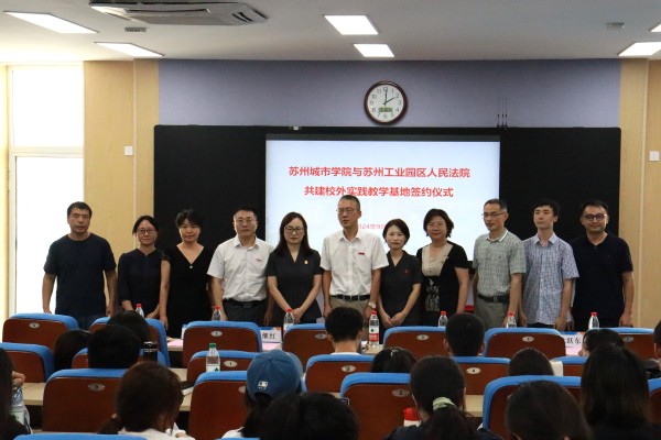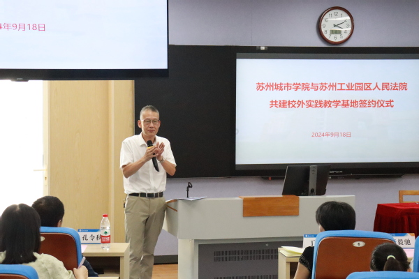 为学习贯彻党的二十届三中全会关于涉外法治工作部署,贯彻落实《江苏省教育厅关于加快推进本科高校新文科建设的意见》明确提出的打造涉外法治人才培养基地的目标任务,加快培养具有国际视野,精通国际法、国别法的涉外法治紧缺人才,9月18日下午,苏州城市学院与苏州工业园区人民法院共建涉外法治人才实践平台签约暨“涉外法治人才实验班”开班仪式在我校顺利举行。苏州工业园区人民法院审判委员会专职委员郭路,苏州工业园区人民法院自由贸易区法庭庭长张继红,我校党委常委、副校长黄涧秋,教务处副处长张毅驰,城市治理与公共事务学院党委书记解燕、副院长丁彩霞、团学办主任刘福、法学专业负责人沈跃东及教师代表,23级“涉外法治人才实验班”全体同学参加了活动。