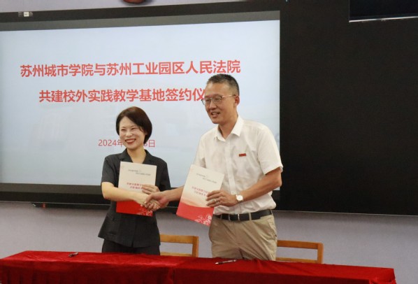 丁彩霞主持了苏州城市学院与苏州工业园区人民法院共建涉外法治人才实践平台的签约仪式。郭路与黄涧秋代表共建单位,签署共建涉外法治人才实践平台协议。