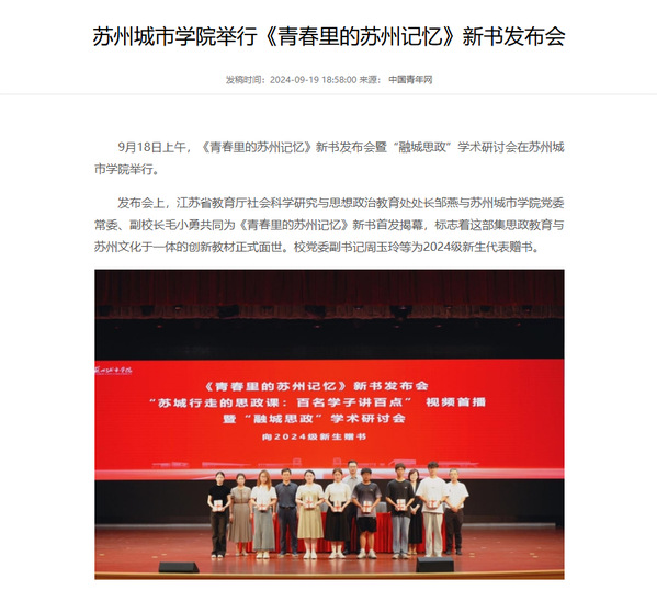 9月18日上午,《青春里的苏州记忆》新书发布会暨“融城思政”学术研讨会在苏州城市学院举行。