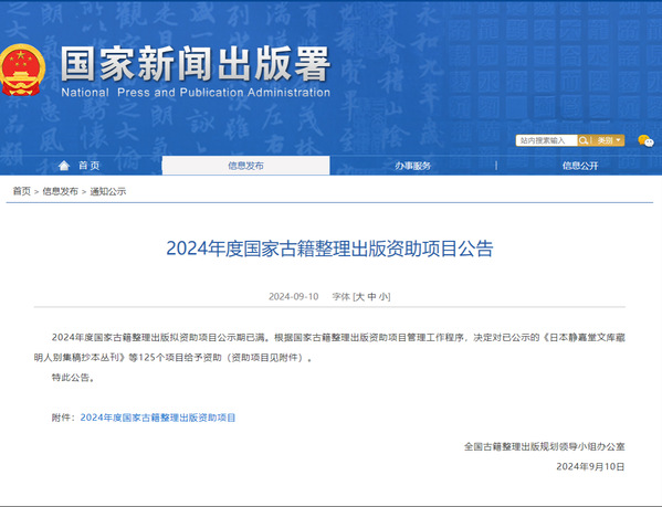 近日,2024年度国家古籍整理出版资助项目名单公示,共125个项目入选。其资助对象是具有较高版本价值和重要文化传承价值,整理方法有所创新、整理成果有所突破的古籍整理出版项目。