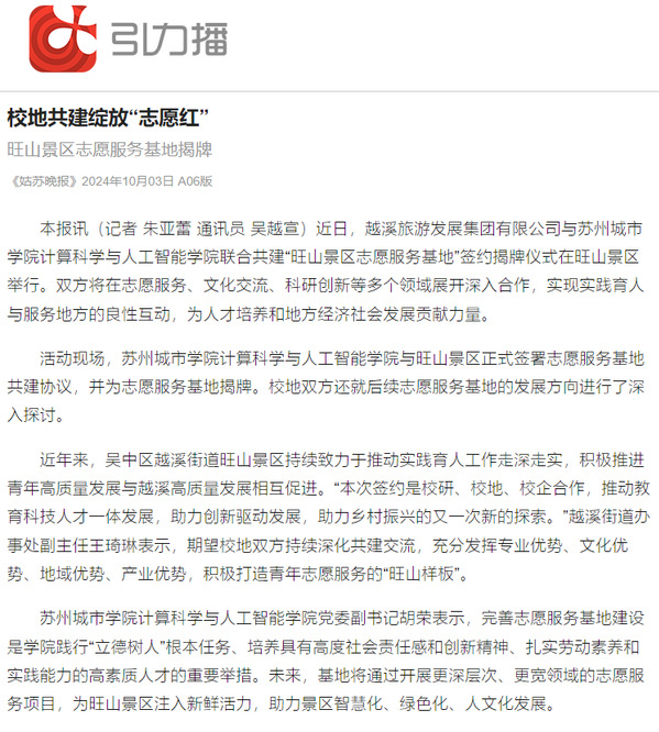 近日,越溪旅游发展集团有限公司与苏州城市学院计算科学与人工智能学院联合共建“旺山景区志愿服务基地”签约揭牌仪式在旺山景区举行。双方将在志愿服务、文化交流、科研创新等多个领域展开深入合作,实现实践育人与服务地方的良性互动,为人才培养和地方经济社会发展贡献力量。
