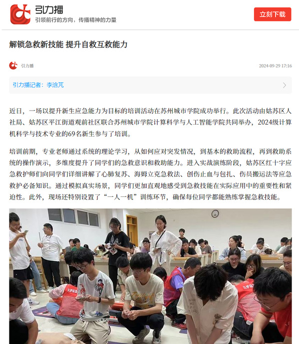 近日,一场以提升新生应急能力为目标的培训活动在苏州城市学院成功举行。此次活动由姑苏区人社局、姑苏区平江街道观前社区联合苏州城市学院计算科学与人工智能学院共同举办,2024级计算机科学与技术专业的69名新生参与了培训。