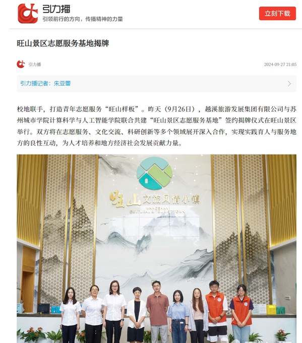 苏州城市学院计算科学与人工智能学院党委副书记胡荣表示,完善志愿服务基地建设是学院践行“立德树人”根本任务、培养具有高度社会责任感和创新精神、扎实劳动素养和实践能力的高素质人才的重要举措。未来,基地将通过开展更深层次、更宽领域的志愿服务项目,为旺山景区注入新鲜活力,助力景区智慧化、绿色化、人文化发展。
