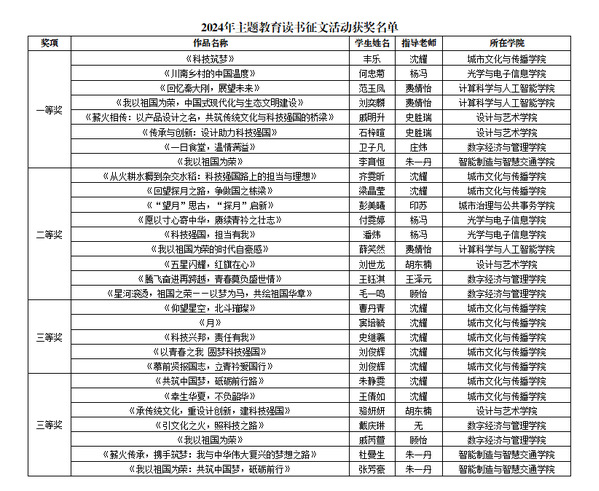 近日,苏州城市学院关心下一代工作委员会(以下简称“关工委”)圆满完成2024年主题教育读书征文活动评选工作。在广大师生的热情参与下,经过专家评审,共评选出一等奖8篇、二等奖9篇、三等奖12篇。获奖作品主题突出、内容深刻、文笔流畅,充分彰显了师生们深厚的爱国情怀和对科技强国建设的深刻理解。