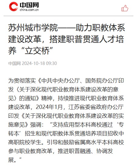 为贯彻落实《中共中央办公厅、国务院办公厅印发〈关于深化现代职业教育体系建设改革的意见〉的通知》精神,持续推进现代职业教育体系建设改革,2024年1月,江苏省委省政府办公厅印发《关于深化现代职业教育体系建设改革的实施意见》强调:“支持应用型本科高校通过‘专转本’招生和现代职教体系贯通培养项目招收中高职院校学生。引导和鼓励省属高水平本科高校参与职业教育改革,推进职普融通、协调发展。”
