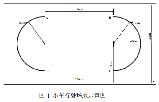 设计一个不限MCU控制的自动行驶小车,能在指定路径上自动行驶,行驶场地示意如图1所示,场地面积不小于220cm×120cm。图中两个对称半圆弧线的半径为40cm,弧线为黑色,线宽1.8cm左右,弧线的四个顶点分别定义为A、B、C和D点。建议场地采用白色哑光喷绘布制作。场地除两个半圆弧外,不得添加任何标记。详细内容以及要求详见附件一。