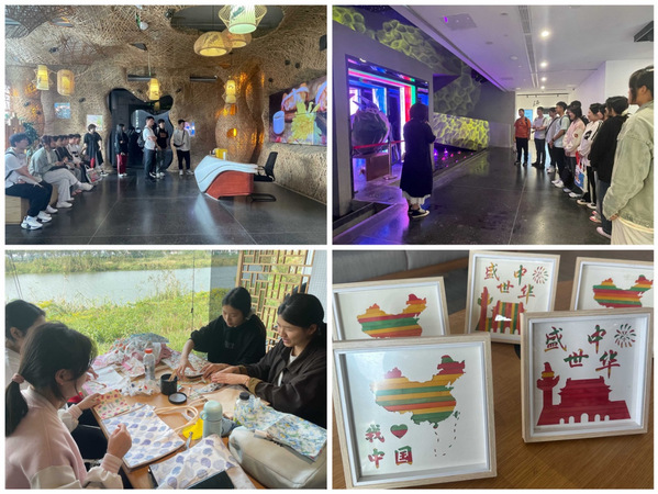 活动以参观阳澄湖大闸蟹文化馆为起点,展开了一场关于蟹文化、蟹产业和蟹艺术的科普探索之旅。通过“好水好蟹”光影秀,“菊黄蟹肥”艺术装置秀,“星夜捕蟹”情景秀等多媒体互动手法,参与者们仿佛置身其间,对阳澄湖大闸蟹的文化底蕴和养殖历史有了深刻的认识。此外,文化馆还特设了手作体验区,让同学们亲手体验传统工艺。无论是竹编画还是巴特包的制作,都让同学们在实践中感受到了传统工艺的精致与江南文化的韵味。同学们制作的一幅幅精美竹编画,呈现盛世中华的形象,这不仅是手工艺的展示,更是对东方美学的一份传承。