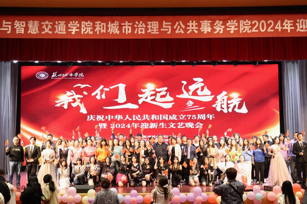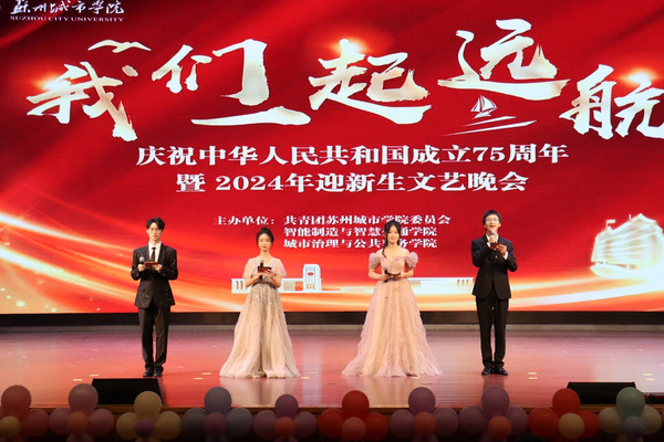 10月23日晚,由共青团苏州城市学院委员会、智能制造与智慧交通学院和城市治理与公共事务学院主办的“我们一起远航”——庆祝中华人民共和国成立75周年暨2024年迎新生文艺晚会在综合楼多功能厅举行。苏州城市学院团委副书记崔苏妍、招生就业处副处长宋丹、党委学生工作部(处)副处长祁素萍、城市治理与公共事务学院党委书记解燕、智能制造与智慧交通学院院长郑建颖、党委副书记钱伟超、教师代表及2024级新生等700余人共同观看晚会。