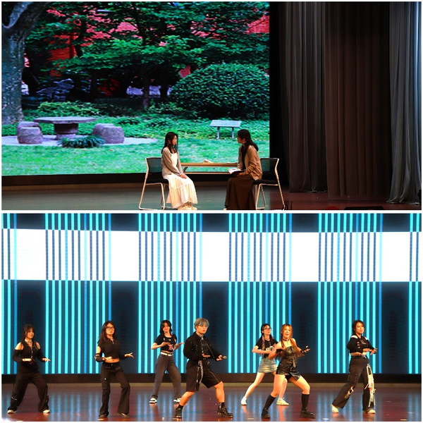 第三章远航:《面具》心理剧深刻揭示了人性的多面性,启发观众思考自我,共鸣观众关爱他人;《甜秘密》轻快的舞蹈,散发出青春的甜蜜气息,传递正能量;《我们一起远航》由城务-智交两个学院全体辅导员领唱,在场师生共同演唱,寓意着不忘初心、牢记使命,共赴未来的美好愿景。